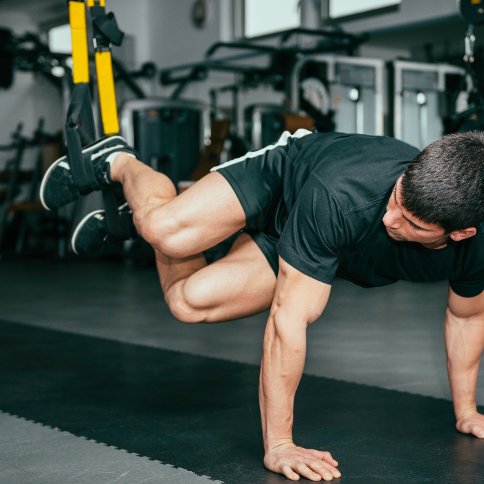 Mouvement de montée de genoux rapide en appui sur les bras, pieds dans les sangles. Excellent pour le travail global, l’endurance et la stabilité du tronc.