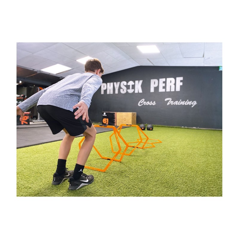 L'échelle d'Agilité Modulable comporte 6 zones hexagonales, modulables partiellement ou en totalité sur simple clic pour créer différents modèles d'entrainement. Il est possible de réaliser des exercices de vitesse, de puissance ou encore de souplesse. Utilisable en mode haies, l'échelle augmente les possibilités d'exercices. Elle permet de travailler les appuis et les changements de direction et d'améliorer le cardio des patients.