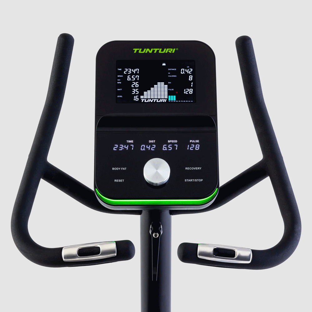 La console du vélo droit E80 Signature de Tunturi possède un écran de 7 pouces rétroéclairé LED/LCD couleur avec faisceau LED vert. L'écran reprend les informations essentielles à la pratique du vélo.