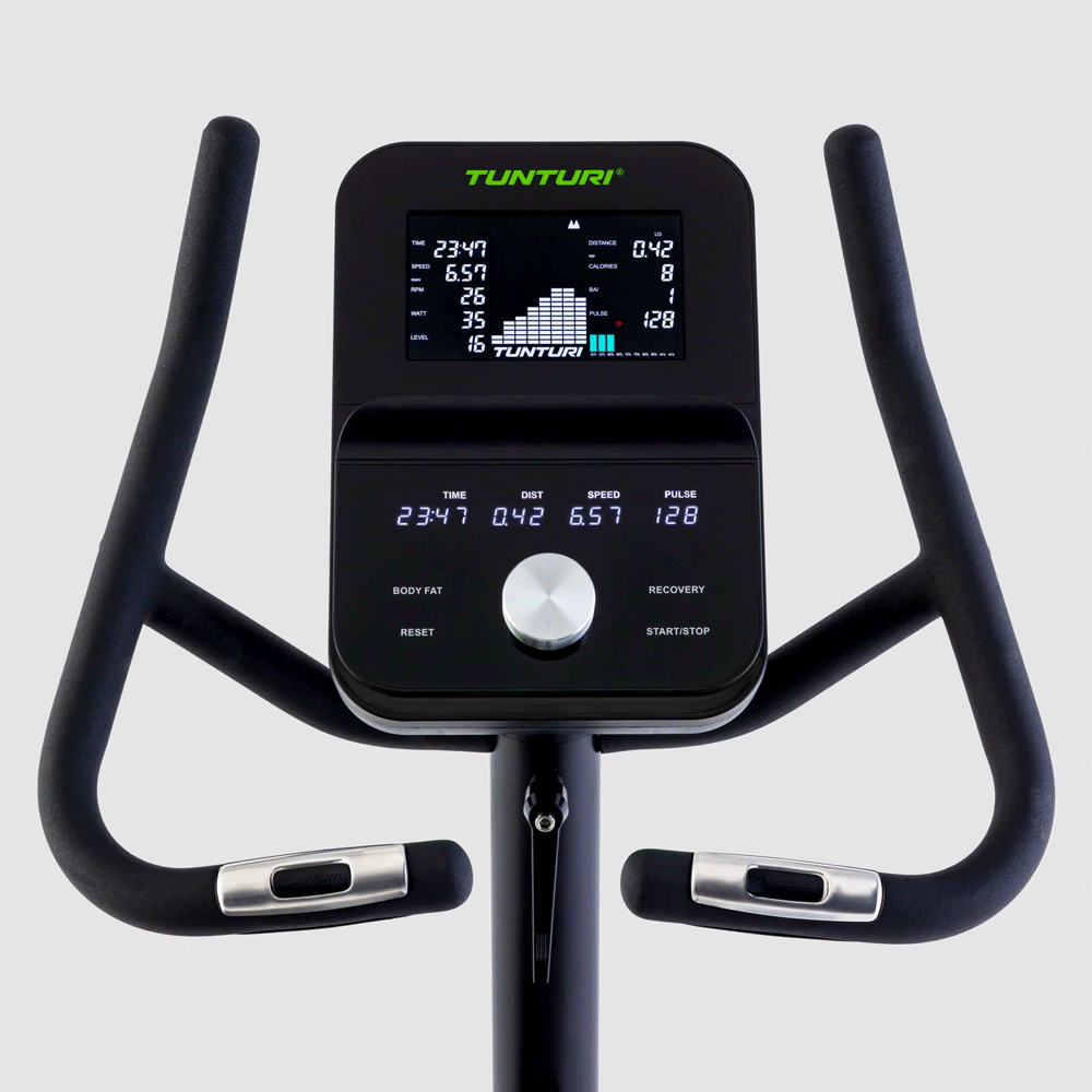 La console du vélo droit E50 Signature de Tunturi est sobre et efficace. L’écran de 7 pouces rétro-éclairé LED/LCD couleur, reprend les informations essentielles à la pratique du vélo : BAI (Body Adiposity Index), temps d'exercice, distance, calories dépensées, vitesse, niveau, pouls, tours/minute, profil d'entraînement, WATT. (Affichage graphique).